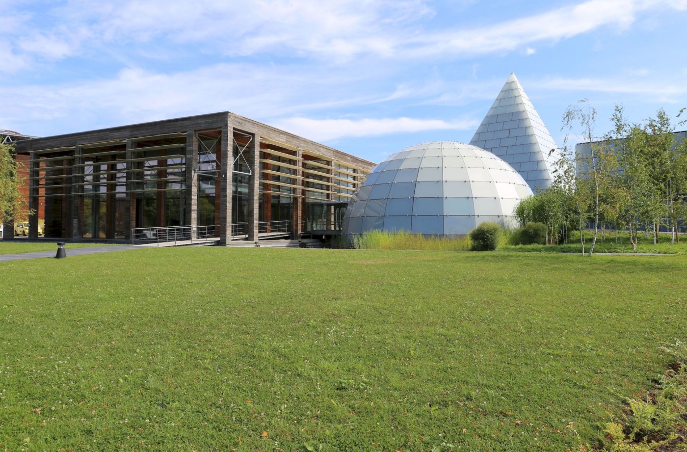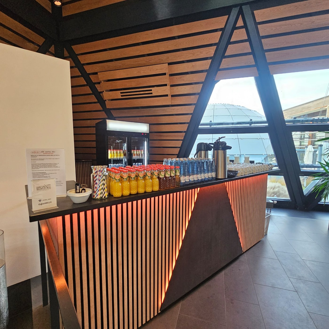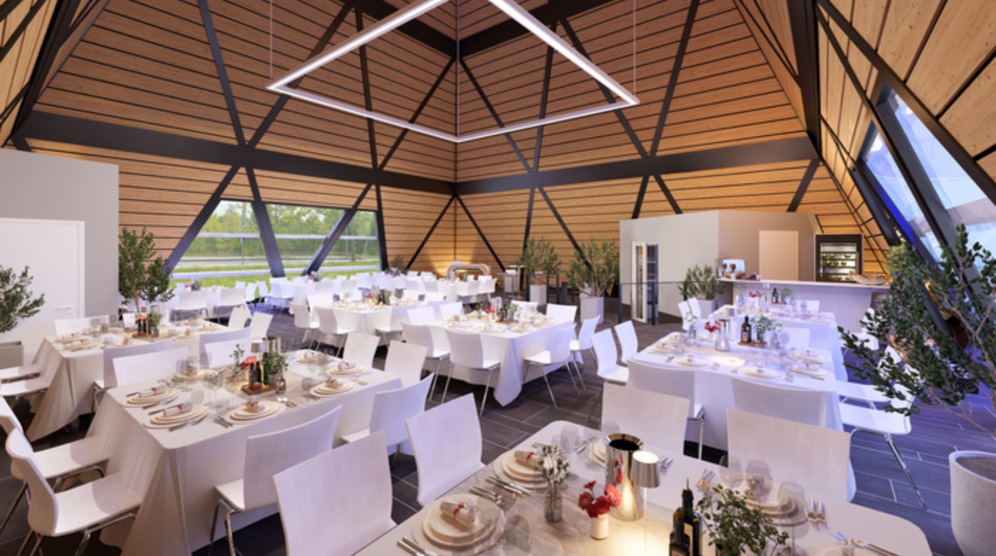 - Räumlichkeiten & Kapazitäten: Pyramide (185 qm, bis 240 Personen), Kuppel (117 qm, bis 156 Personen), Konferenzraum (80 qm, bis 26 Personen) sowie ein nutzbarer Innenhof.